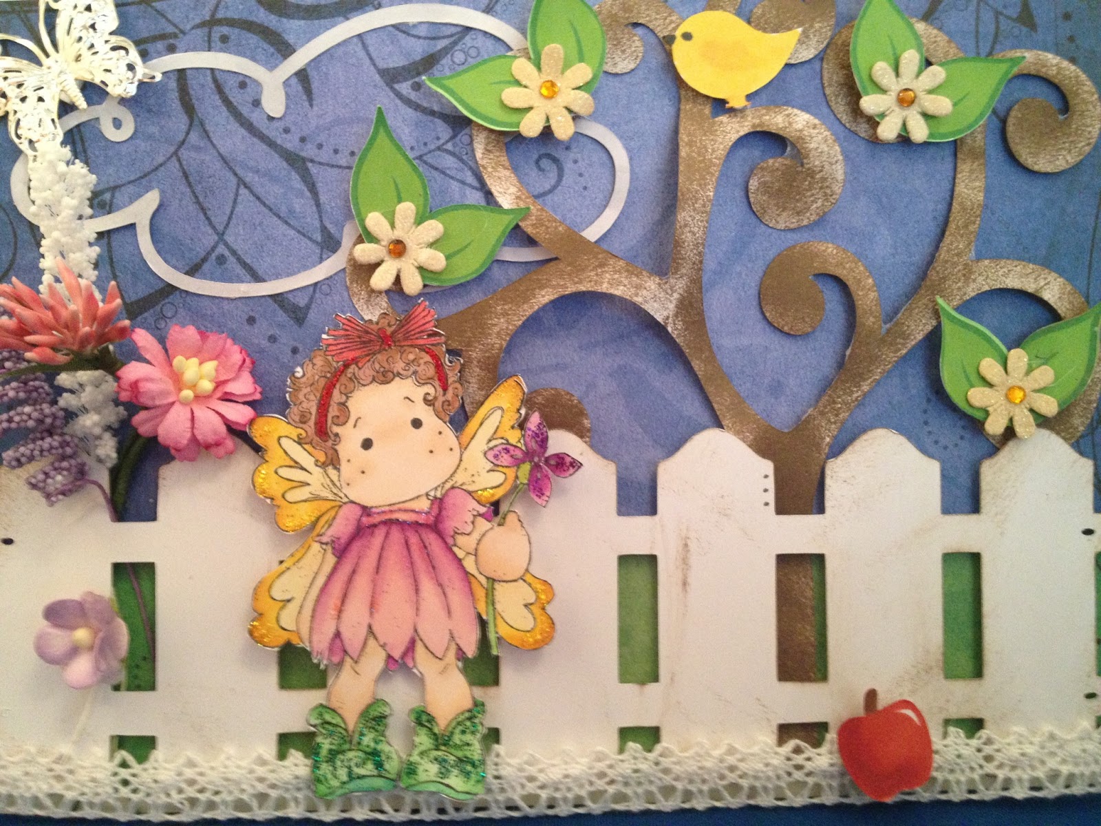 I added some lace and flowers from my stash and just happened to have the perfect card to back it all on, for a 'grass' and 'sky' scene. i wanted a tad bit of dimension to the card so i used some foam pads for the fence, and some of the branches on the tree, also with tilda and the fallen apple :)